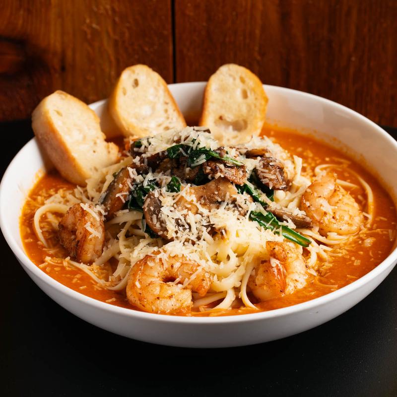 Sauteed shrimp, spinach, mushrooms in a vodka sauce over linguine.