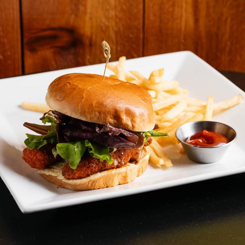 Our famous panko tenders tossed in buffalo sauce, ranch, spring mix, tomatoes, pickles on brioche bun served with fries.
