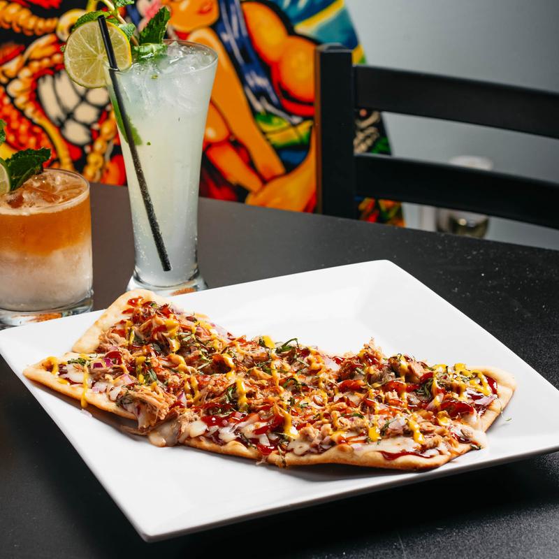 Flatbread topped with honey BBQ, kalua pork, mozzarella, red onion, fresh basil, drizzled with honey mustard.