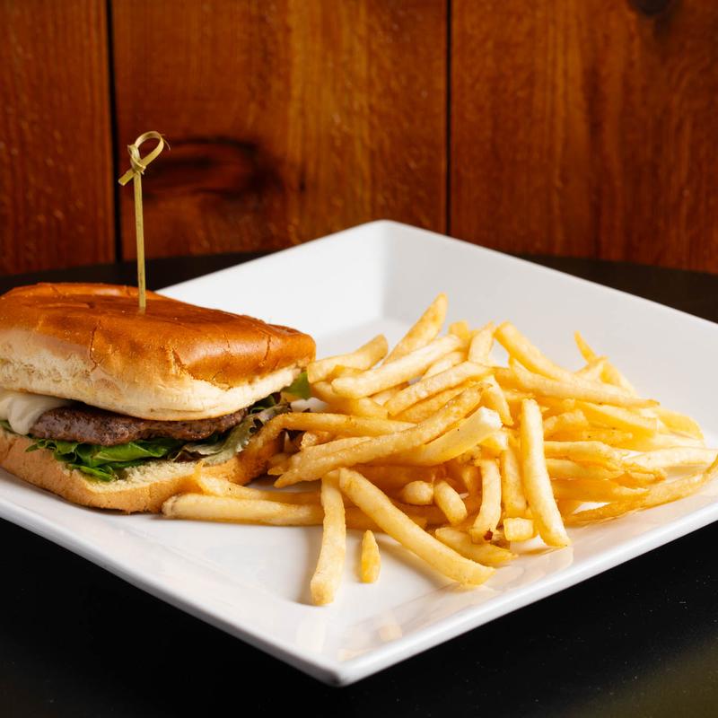 Two sirloin patties, American/Swiss/Pepper jack, spring mix, tomato, pickles, onion, on brioche bun served with fries.