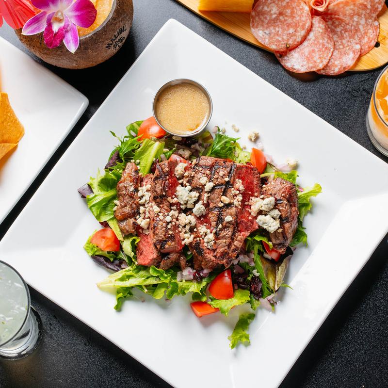 Spring mix, 8 oz sliced top sirloin, blue cheese crumbles, tomatoes, grilled red onion, cranberries & white balsamic vinaigrette.