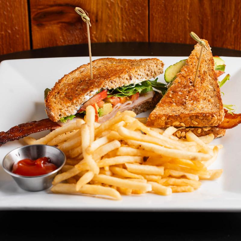 Toasted multigrain bread with turkey, smashed avocado, bacon, tomato, spring mix, whipped cream cheese, & jalapeno ranch. Served with sweet potato or regular fries.
