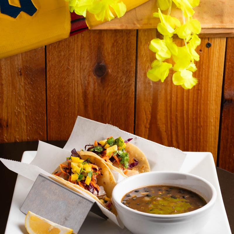 2 Blackened mahi tacos topped with rainbow slaw & fresh mango salsa. Served with black bean soup.